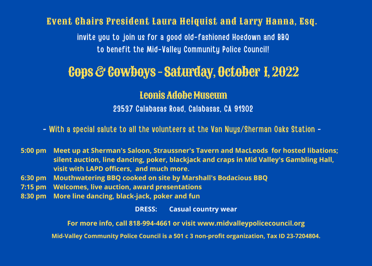 Each year the Mid-Valley Community Police Council has presented our annual fundraiser – Cops & Cowboys – as a way to both honor community leaders and raise awareness and funds for our programs. A good time is had by all – as evidenced in the photos below from some of our past events.